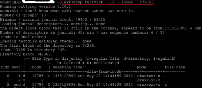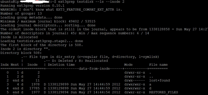 ext3grep testdisk –restore-all –after 1338133162 –before 1338133251 –histogram=dtime
