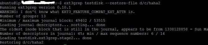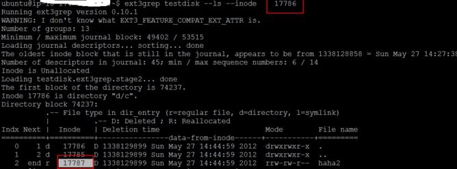 找到需要恢复的文件后直接使用 ext3grep testdisk –restore-file d/c/haha2 恢复d/c/haha2